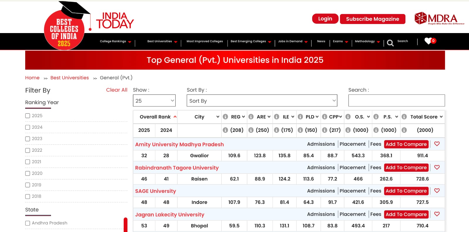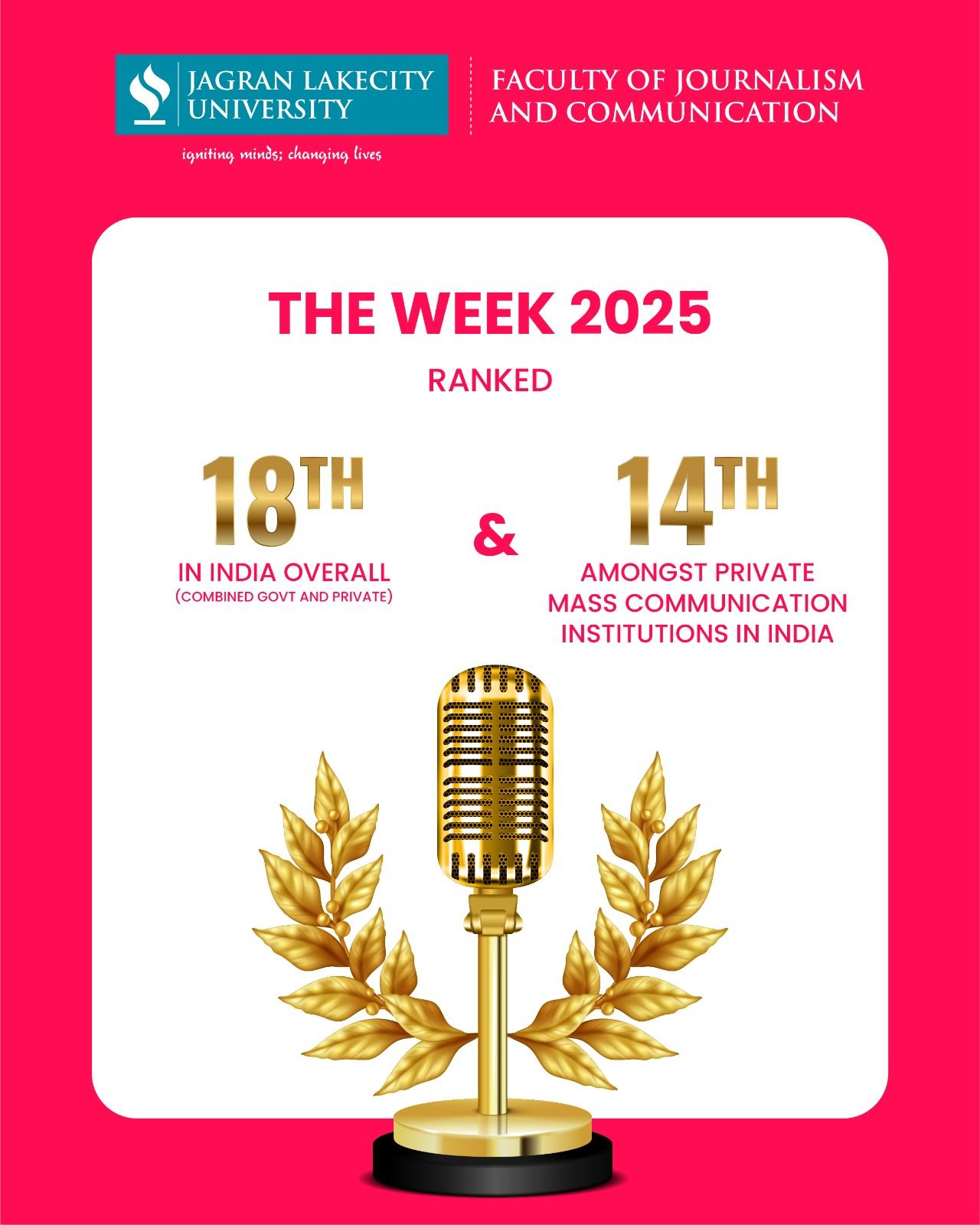 India Today and Outlook India, has ranked Jagran School of Journalism and Mass Communication, JLU Bhopal as No.1 in Madhya Pradesh and top 15 in India in 2020 and the University has been bestowed with several prestigious awards, such as ‘University of the Year’ by Government of Madhya Pradesh for consecutive five years from 2015 to 2019 and is recognized as a Global League Institution in 2015 at the House of Commons, London, UK